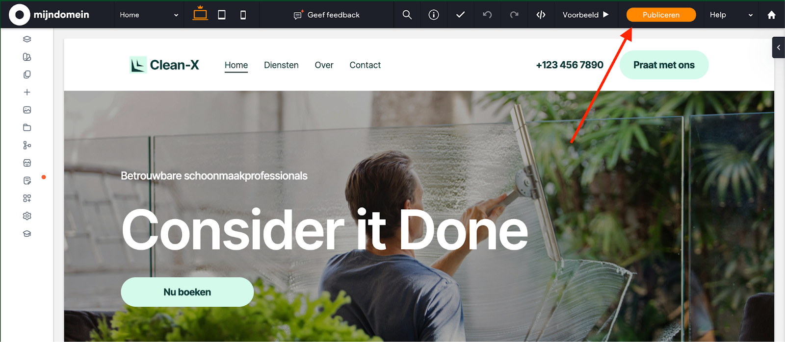 Als je begint met je nieuwe website is deze standaard nog niet gepubliceerd. Alle wijzigingen worden automatisch opgeslagen. Pas als jij vindt dat je website klaar is, klik je op de oranje knop "Publiceren", rechts bovenin de editor.