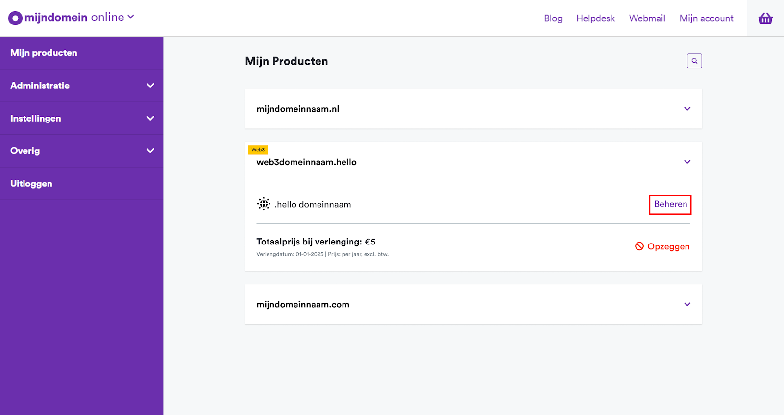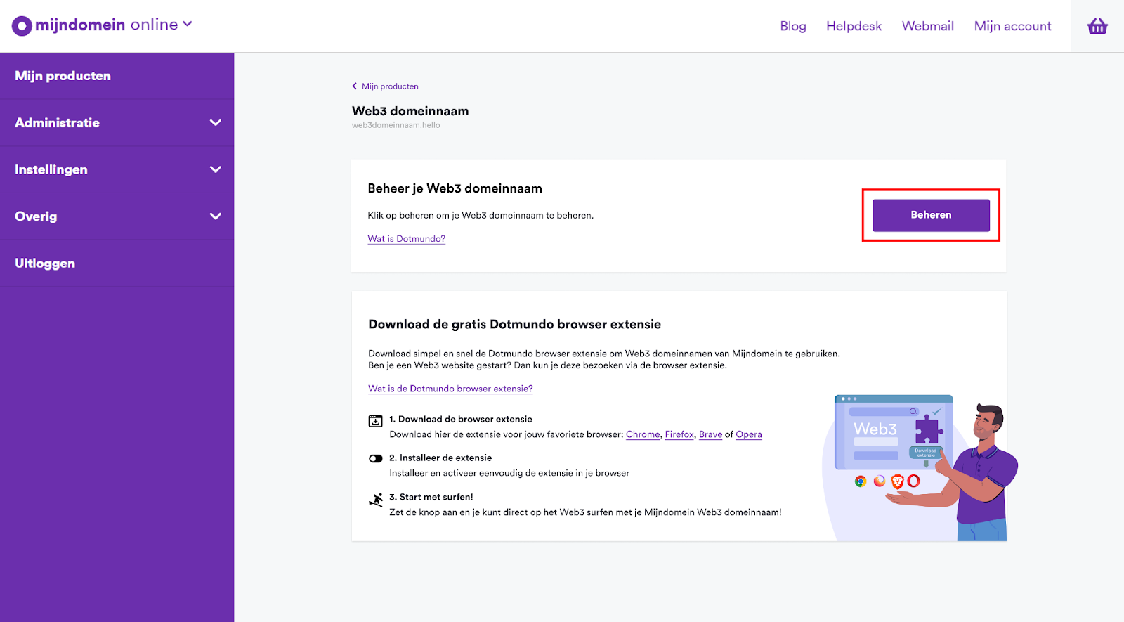 - Je komt nu op een tussenpagina met meer informatie over je Web3-domeinnaam. Klik hier op de knop Beheren.