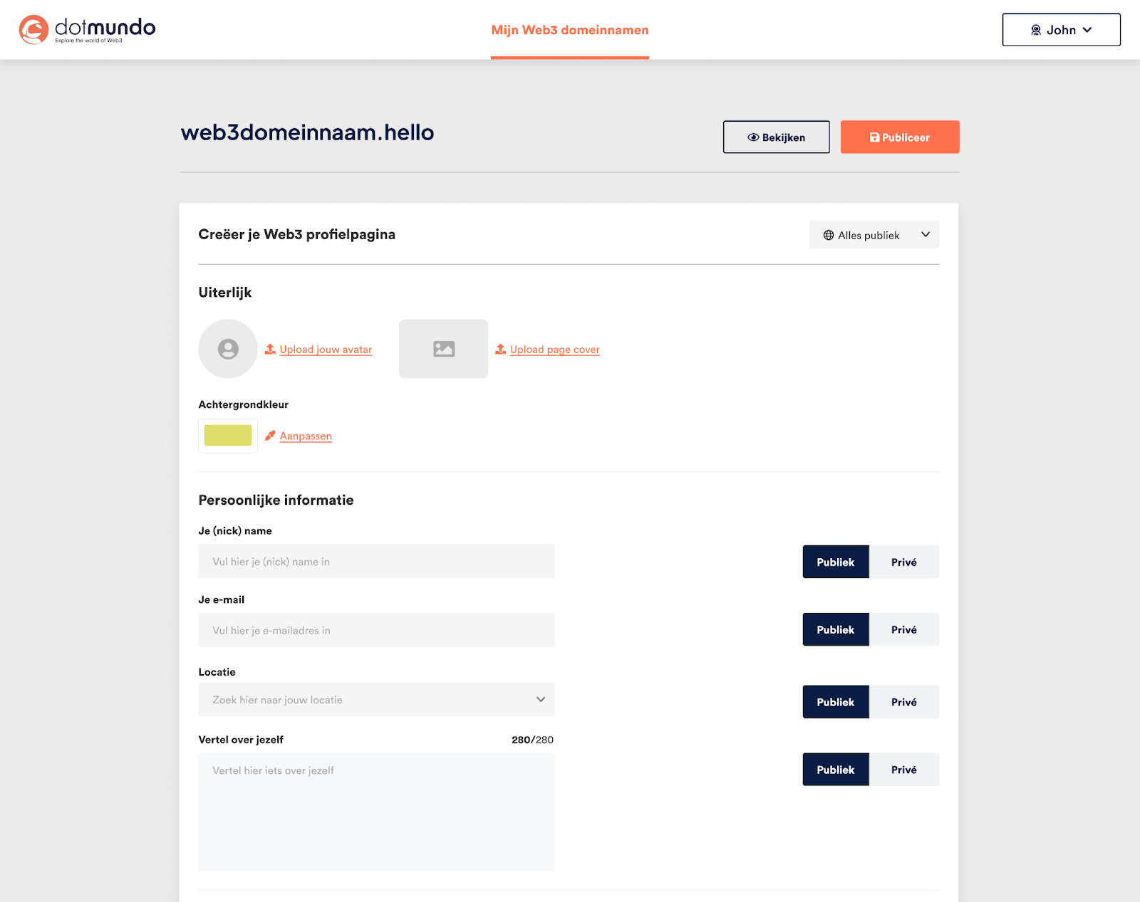 - Je komt nu op de pagina terecht waar je de informatie kunt invullen die je graag wilt delen op je profielpagina. Je kunt er ook voor kiezen om bepaalde informatie wel of niet zichtbaar te zetten (publiek/privé). Wanneer je al jouw informatie hebt ingevuld, klik je op Publiceren.