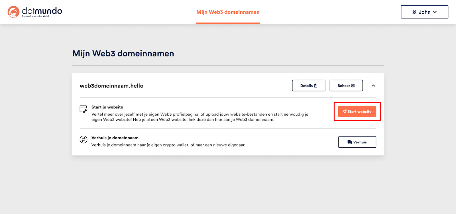 - Je wordt nu automatisch doorverwezen naar je Dotmundo beheeromgeving. Je kunt nu je Web3-profielpagina starten door op je domeinnaam te klikken en te kiezen voor Start website.