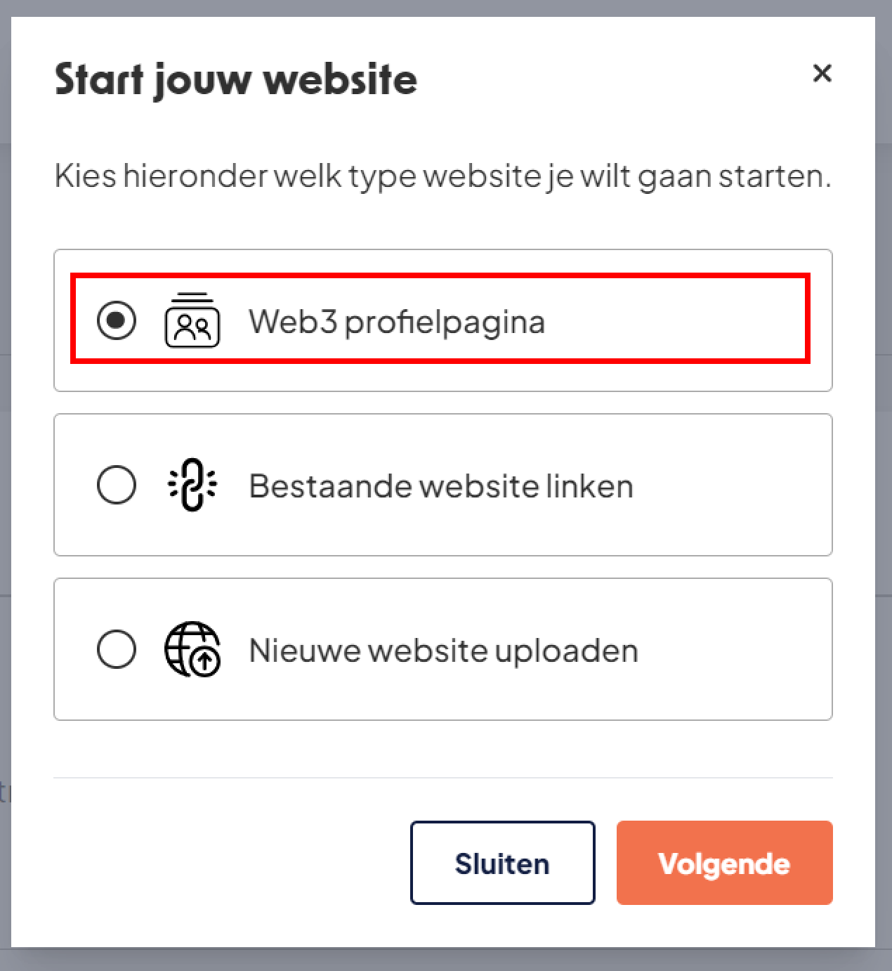 - Vervolgens krijg je drie opties te zien. Kies hier voor de optie Web3 profielpagina en klik op Volgende.