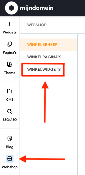 Klik in het linker paneel op 'Webshop' en vervolgens op 'Winkelwidgets'.