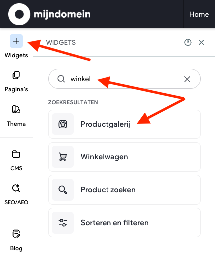 Of klik op de '+' (bij 'Widgets' of Toevoegen) en zoek op het woord 'Winkel'.