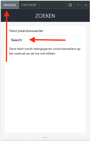 Bij de classic editor kom je direct bij 'INHOUD' en kun je de tekst aanpassen. Bij de editor 2.0 mag je eerst nog even op 'Inhoud' klikken om in het tekstveld te komen. Je kunt zien of je de editor 2.0 hebt door bovenin de editor te kijken bij de desktop weergave. Het icoontje is dan oranje en heeft een kroontje: - In het veld 'Tekst plaatsbewaarder' kun je de tekst invoeren die verschijnt in de zoekbalk van de Product Zoeken-widget. Deze tekst verdwijnt zodra de klant begint te typen.
