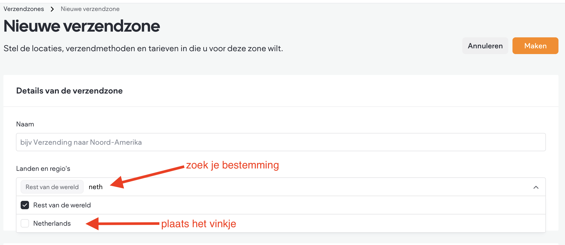 - Selecteer je land(en) en regio('s) (indien van toepassing) in het dropdown-menu 'Landen en regio's'. Het zijn nogal veel opties dus je kunt ook zoeken. Nederland is te vinden via 'Netherlands'. Zet het vinkje bij het betreffende land of landen. Let op: zelf een naam invullen zoals bij een productoptie werkt niet. Er moet echt een vinkje geplaatst worden bij het betreffende land.