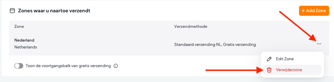 Klik op het pictogram met de drie horizontale stippen naast de verzendzone die je wilt verwijderen en selecteer Verwijderzone.