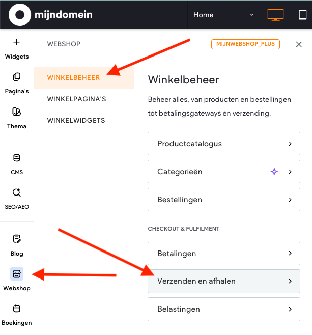 - Klik in het zijpaneel op Webshop en vervolgens op WINKELBEHEER.