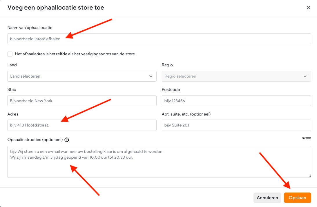 - Voer de naam van de afhaallocatie in, samen met de adresgegevens en eventuele optionele afhaalinstructies.