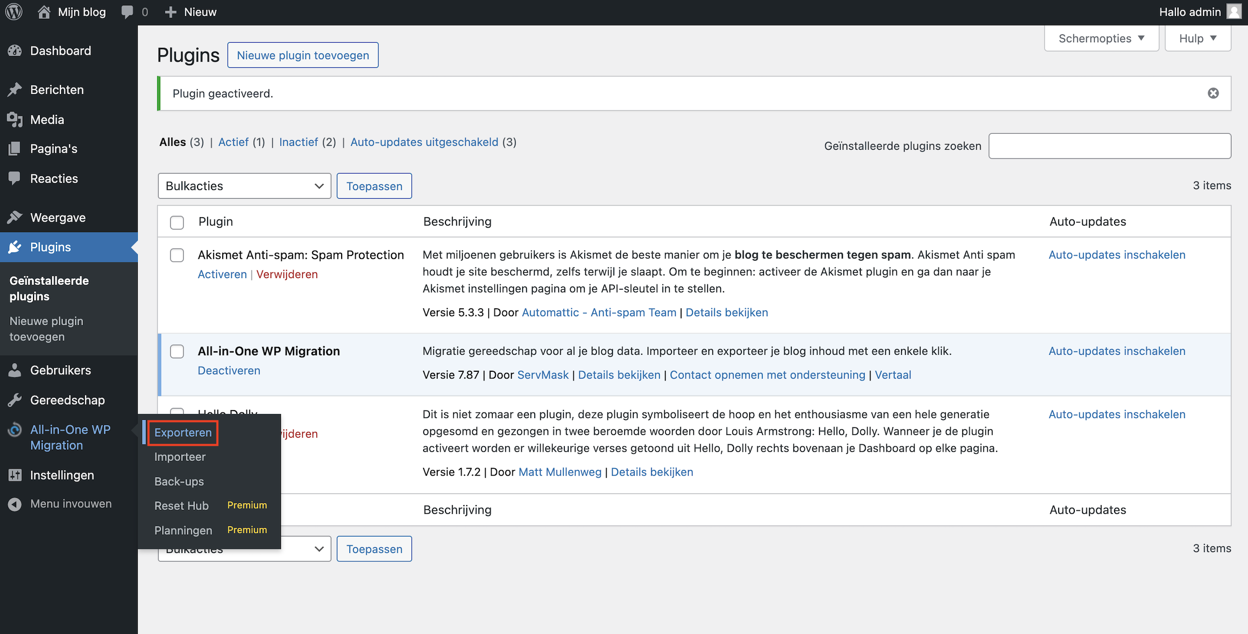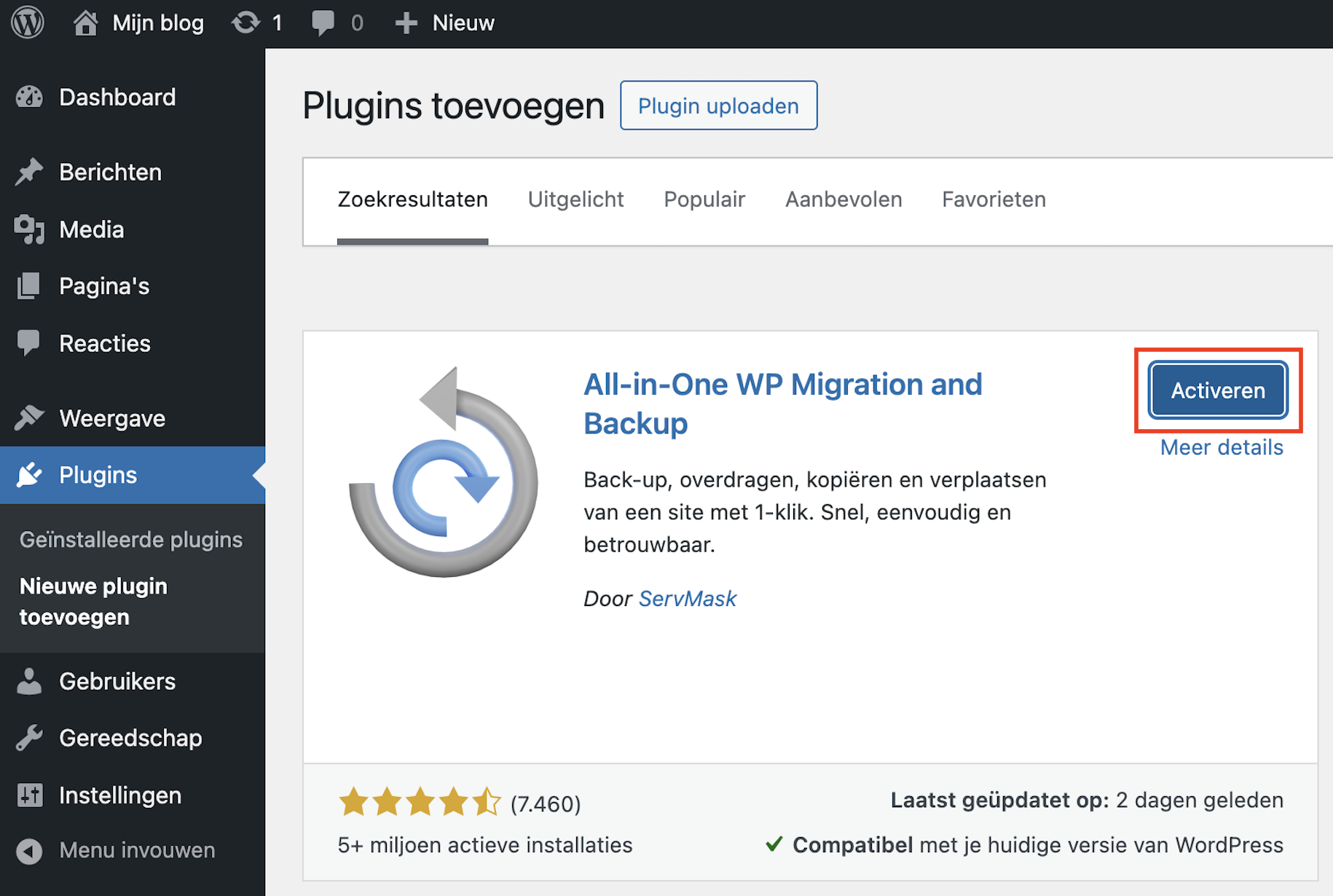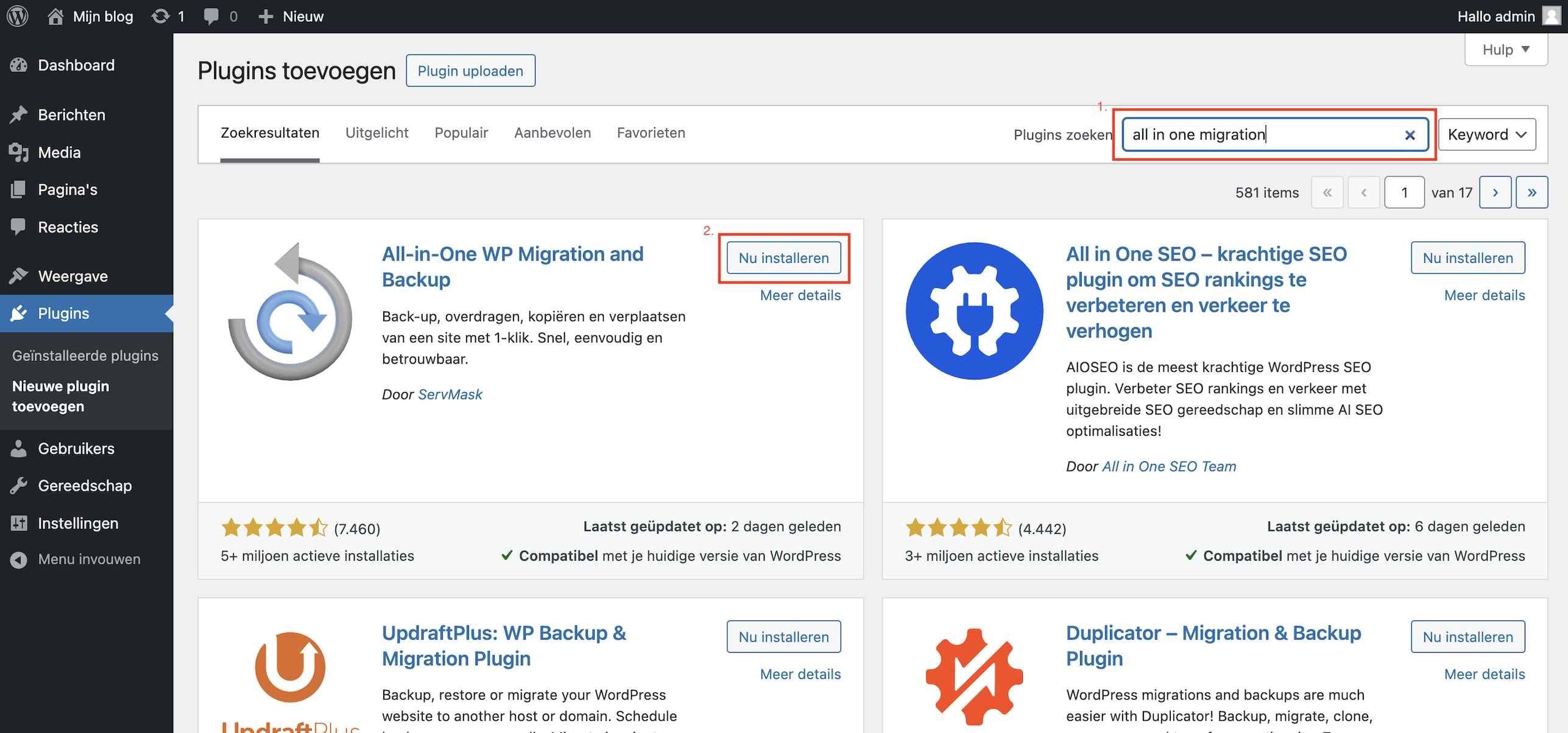 3. Installeer en activeer ook hier de All-in-One WP Migration plugin (Zie stap 1).