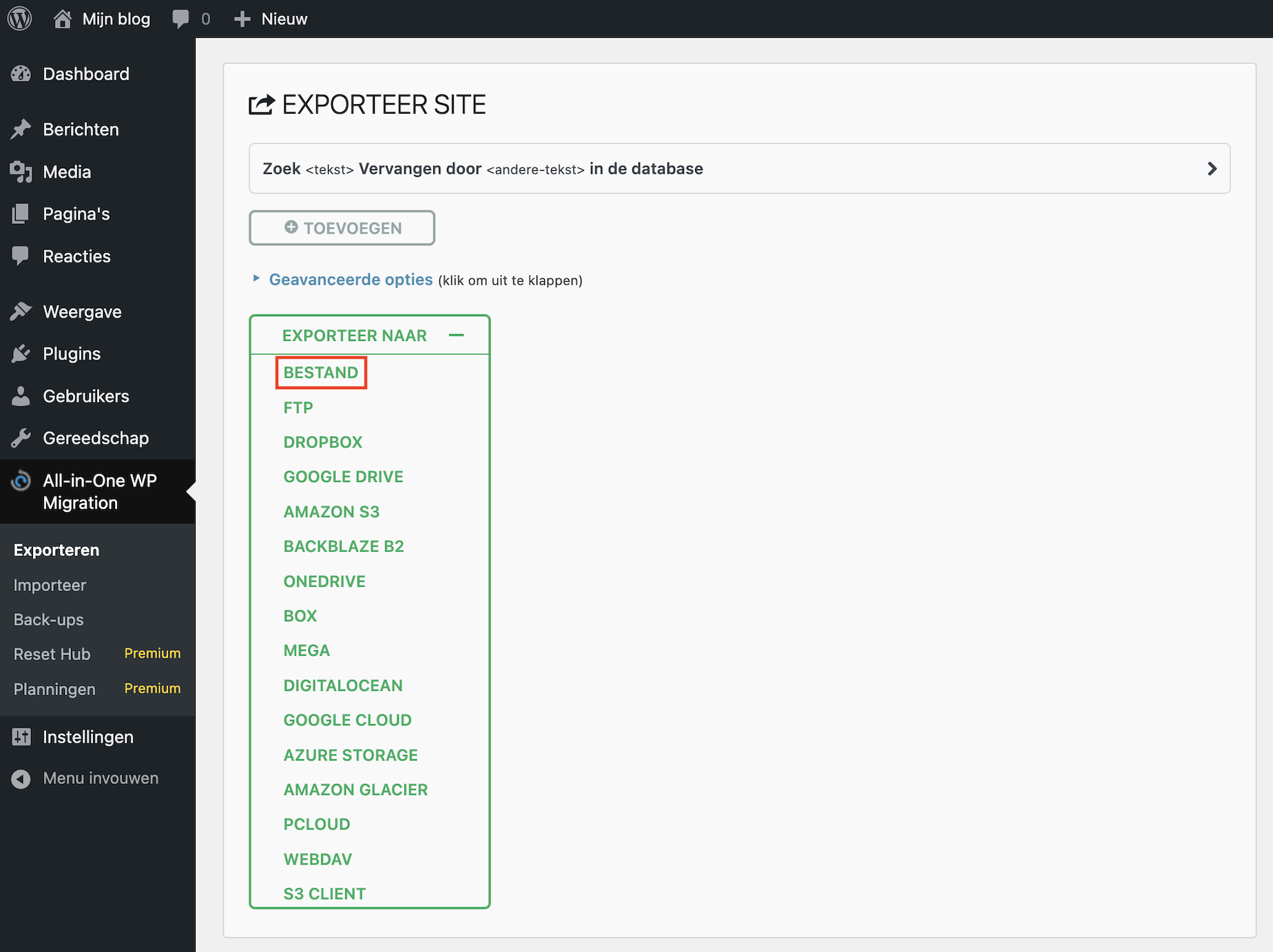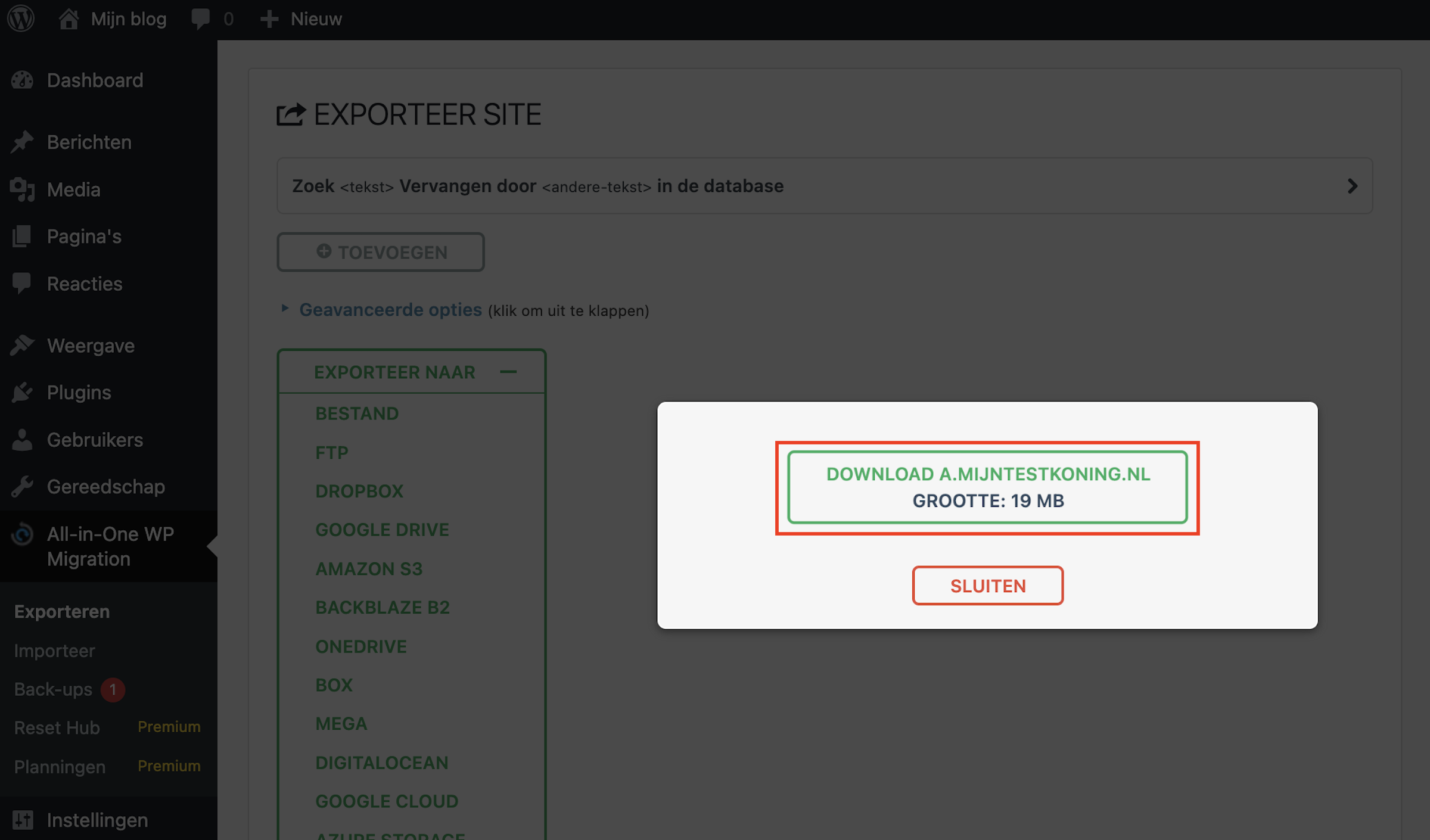 1. Ga naar All-in-One WP Migration in het WordPress-menu aan de linkerkant, druk op Exporteren.