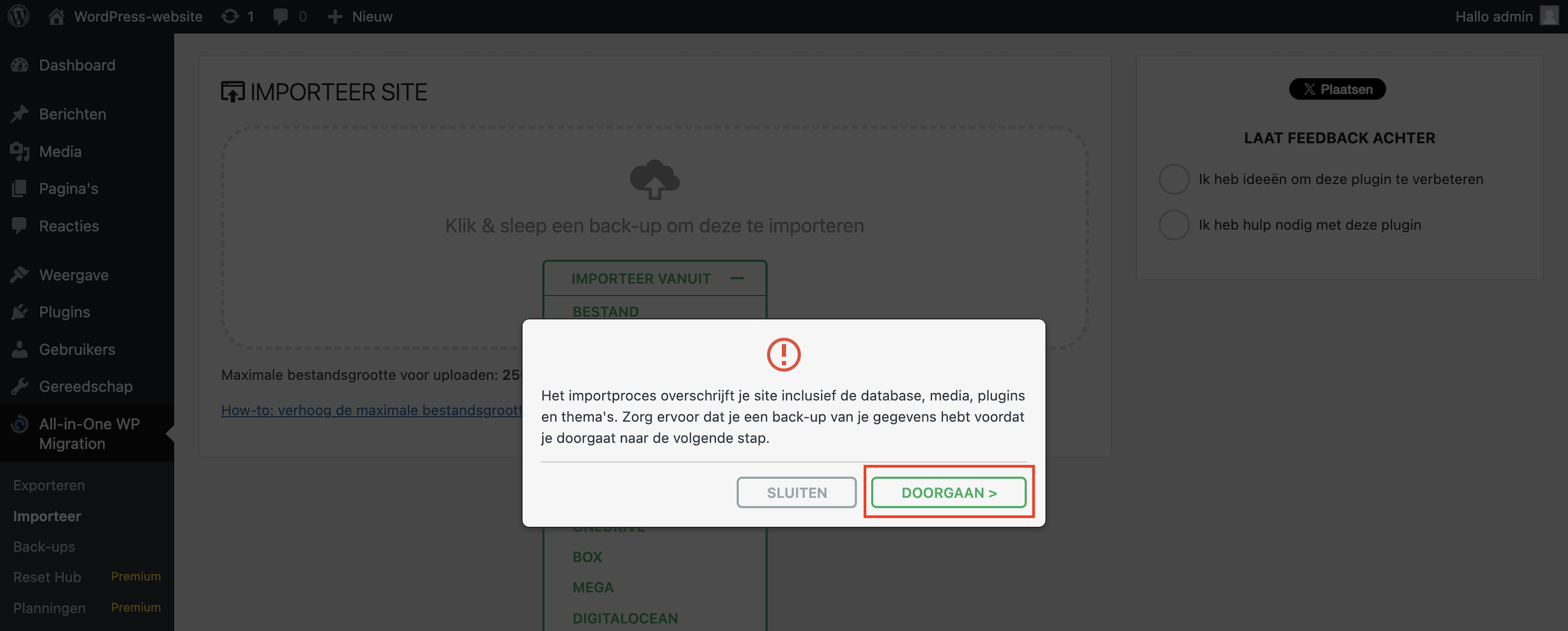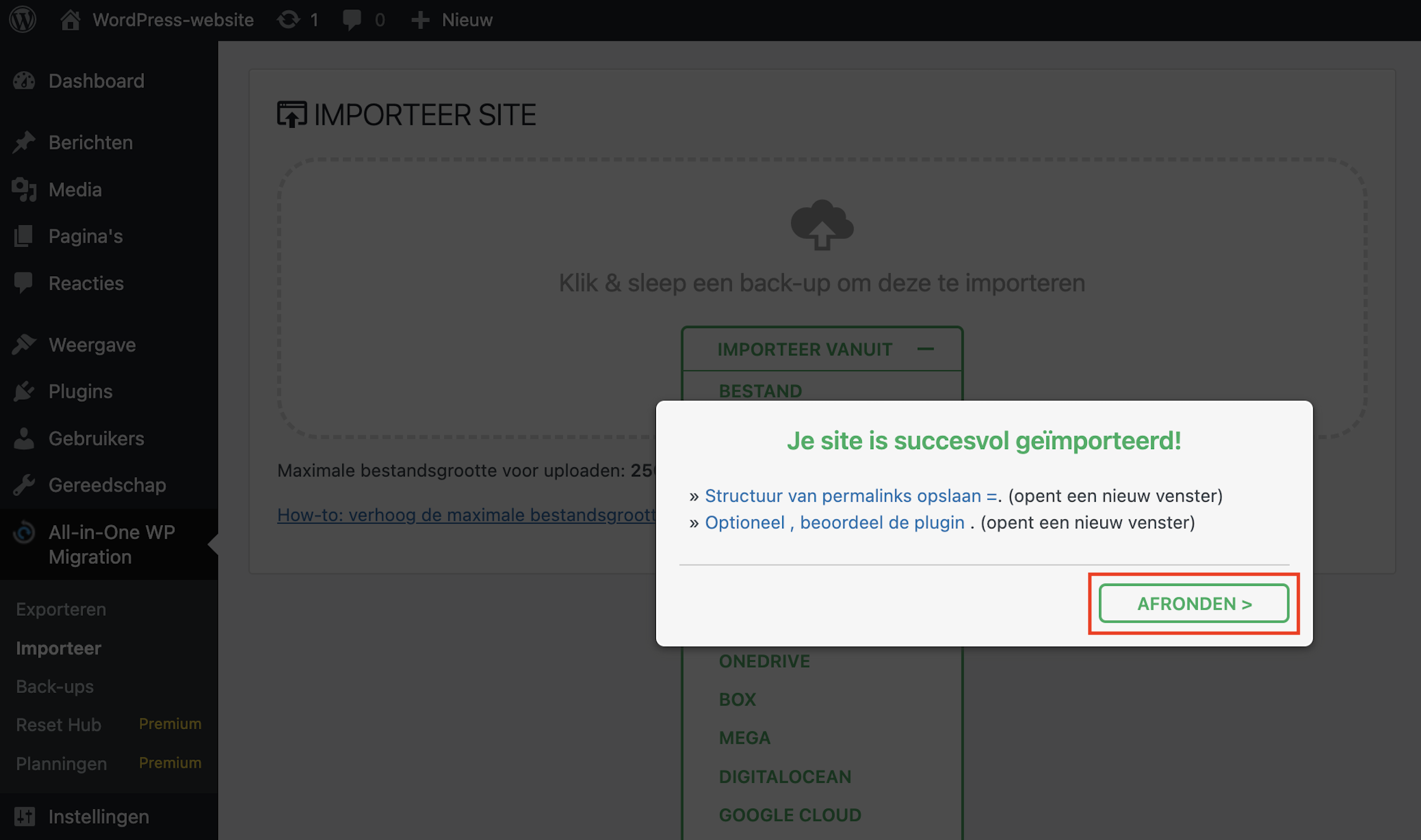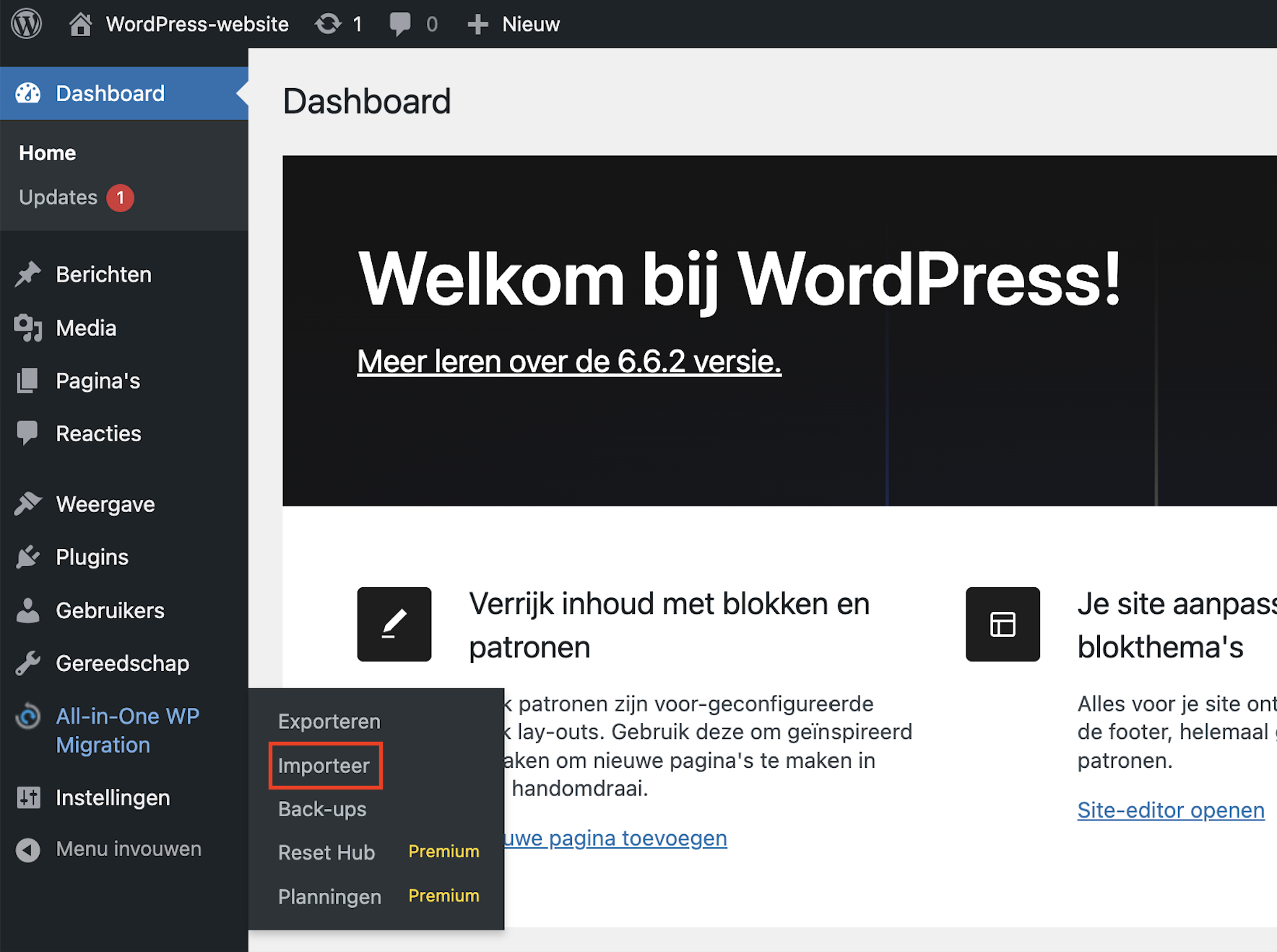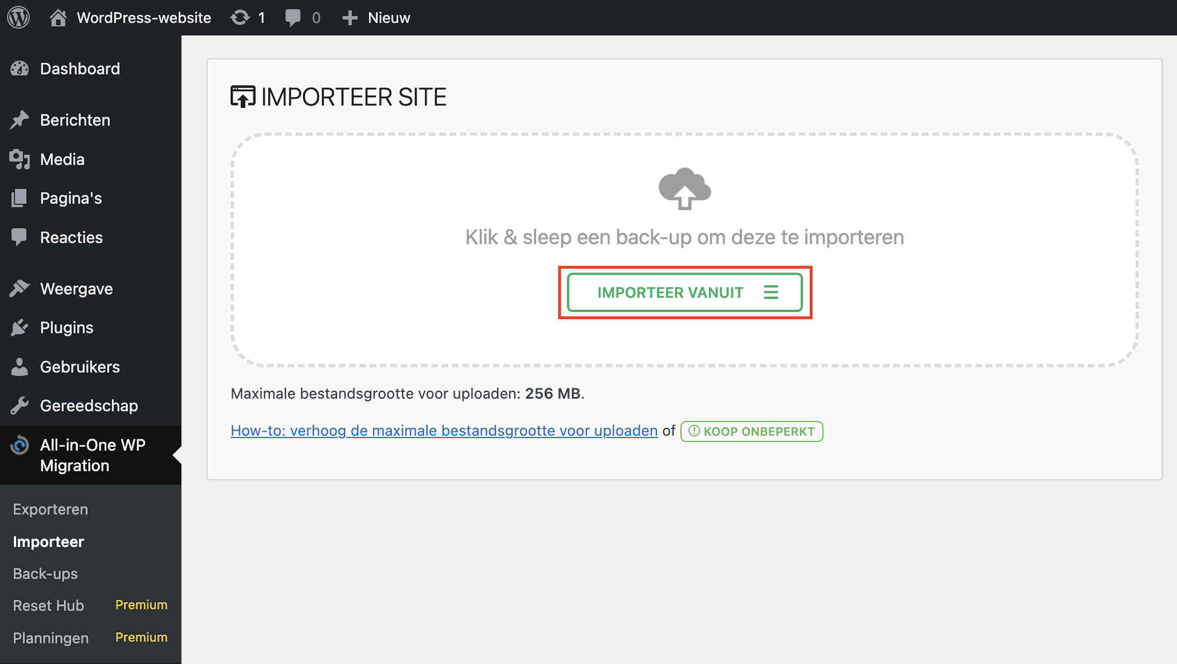 1. Ga naar All-in-One WP Migration in de WordPress-omgeving van domein B en druk op Importeren.