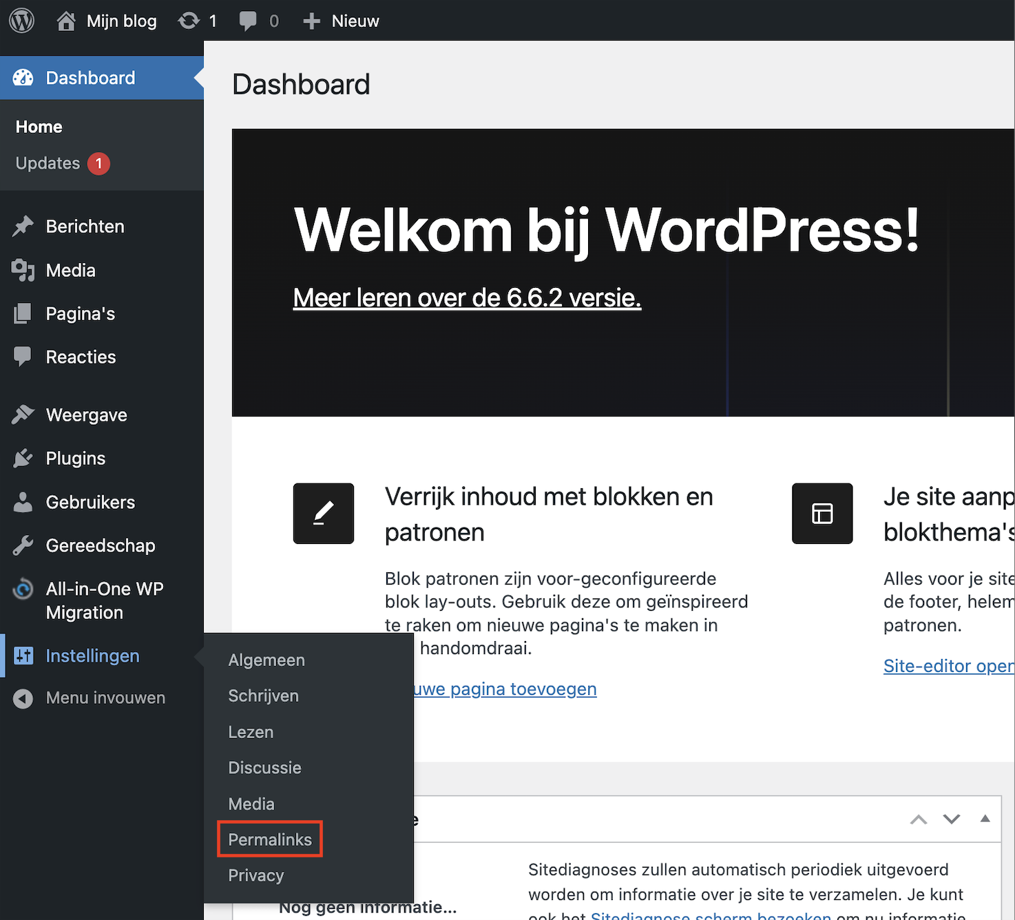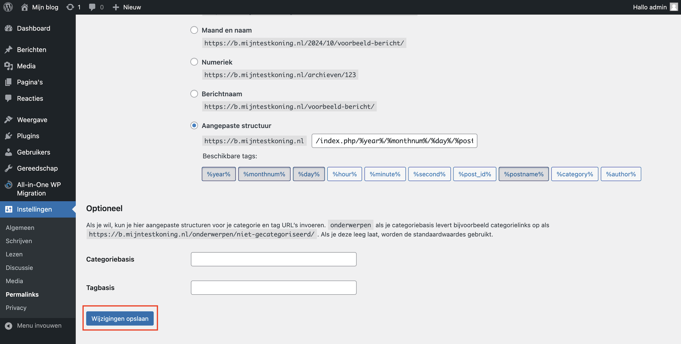 2. Nadat de import is voltooid, moet je de Permalinks opnieuw opslaan. Ga naar Instellingen > Permalinks.