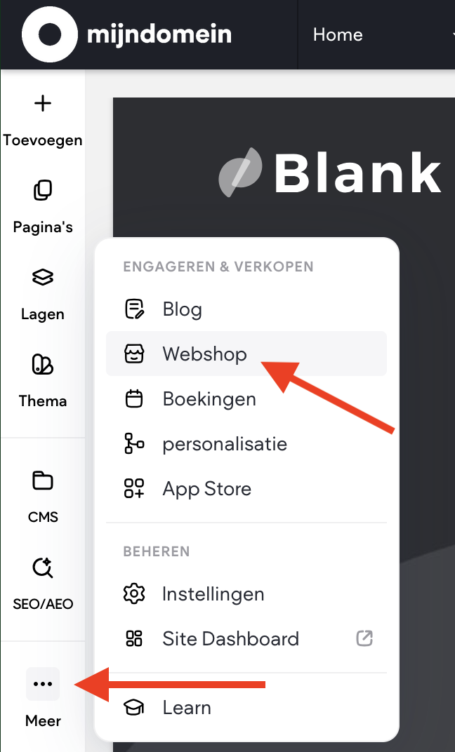 Als je aan de linkerkant nog geen optie Webshop ziet kun je hem zelf toevoegen. Dit kan door aan de linkerkant onderaan bij Meer op de 3 puntjes te klikken. Je kunt dan de optie Webshop kiezen.