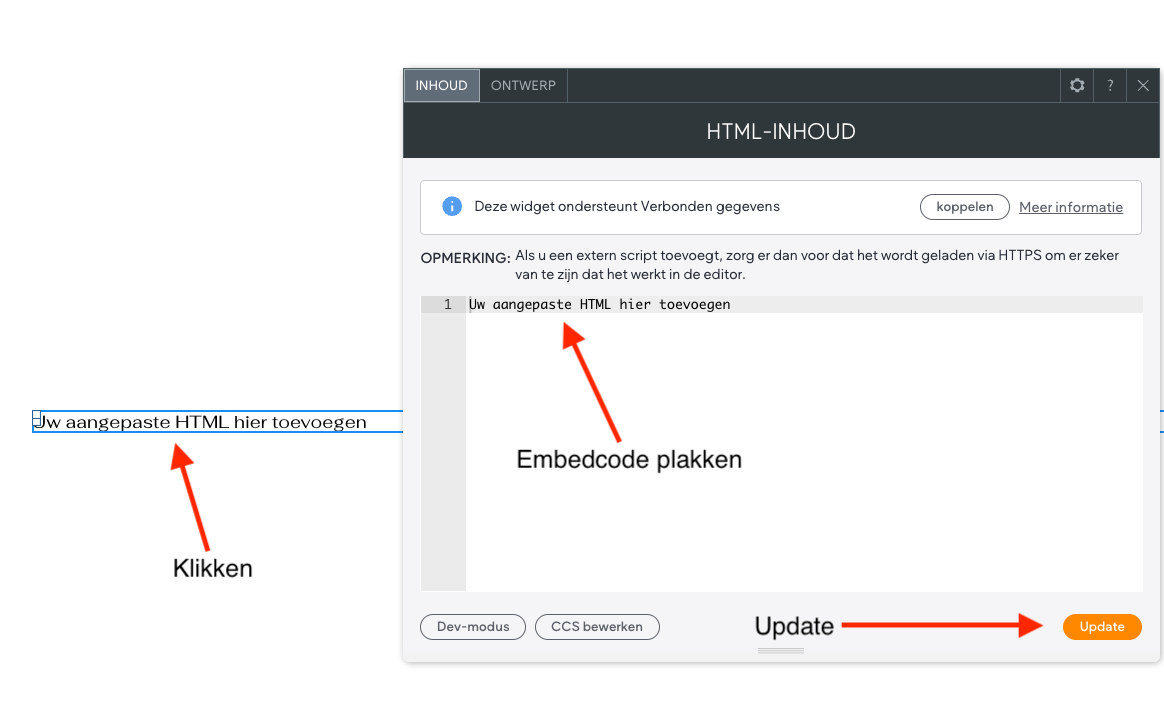 - Je kunt nu de embedcode plakken in de widget. De tekst 'Uw aangepaste HTML hier toevoegen' mag je verwijderen en vervolgens kies je "Update".
