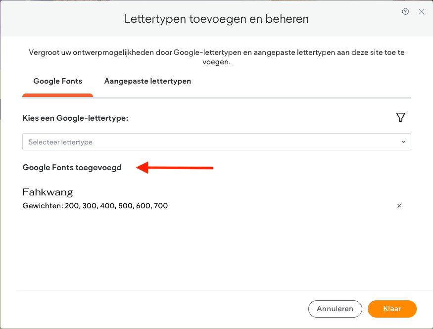 - Er opent nu een scherm waarin je direct kunt zien welke Google Fonts er al actief zijn in je site onder Google Fonts toegevoegd: