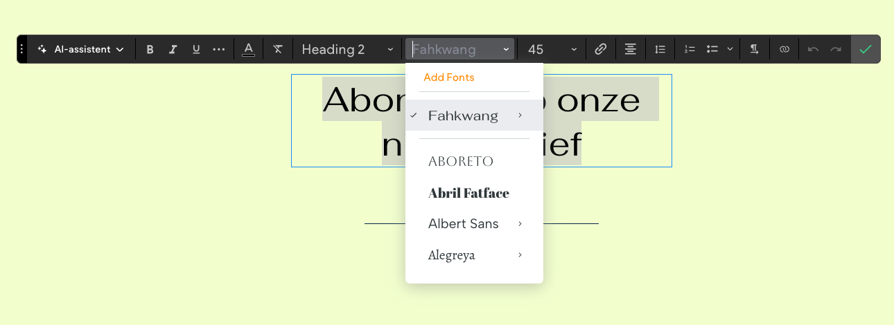 Het Google Font is nu beschikbaar op alle plekken in de editor waar je met tekst kunt werken en een lettertype kunt instellen.