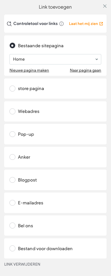 kan je gebruiken om een link in te stellen op één of meerdere woorden. Selecteer het stukje tekst waar je een link van wilt maken en klik vervolgens op het icoontje om je link in te stellen. Je link kan naar één van je eigen pagina's verwijzen, een store pagins maar ook een externe URL, een pop-up, anker, blogpost, e-mailadres, belknop of zelfs een bestand voor downloaden.