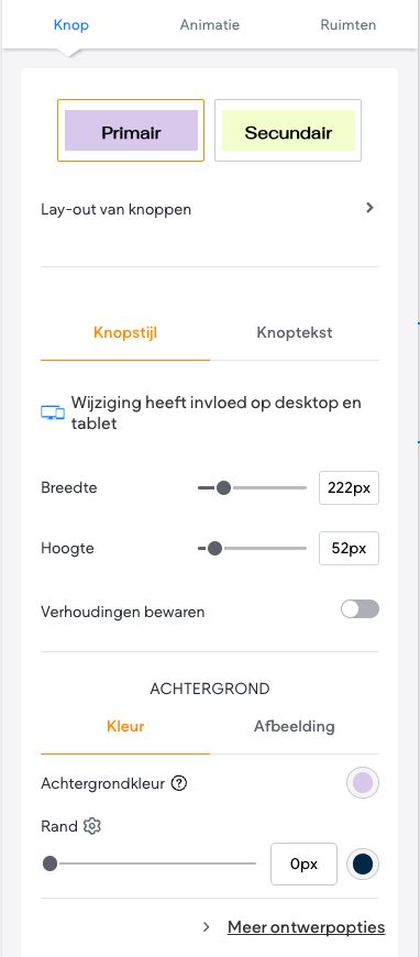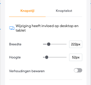 Bij "Knopstijl" kan je het formaat van jouw knop wijzigen. Pas hier de Breedte of Hoogte van je knop aan. Wil je graag de verhoudingen van je knop bewaren terwijl je de breedte of hoogte van je knop aanpast? Zet dan de "Verhouding bewaren" schuifknop aan.