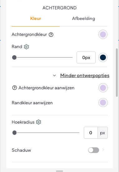 Bij het "Achtergrond" gedeelte kunnen we de knop een Kleur of Afbeelding meegeven. Ook kunnen we de knop hier een "Rand" geven.