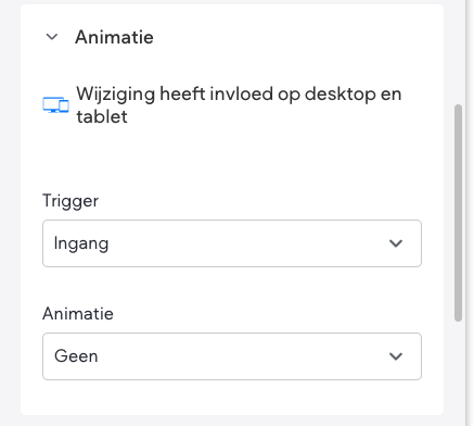 Via "Animatie" kan je de knop laten bewegen. Zo kan je een "Trigger" kiezen, dit is de oorzaak voor het bewegen (Bijvoorbeeld het laden van de pagina) en een "Animatie", wat dus de daadwerkelijke animatie van de knop bepaalt.