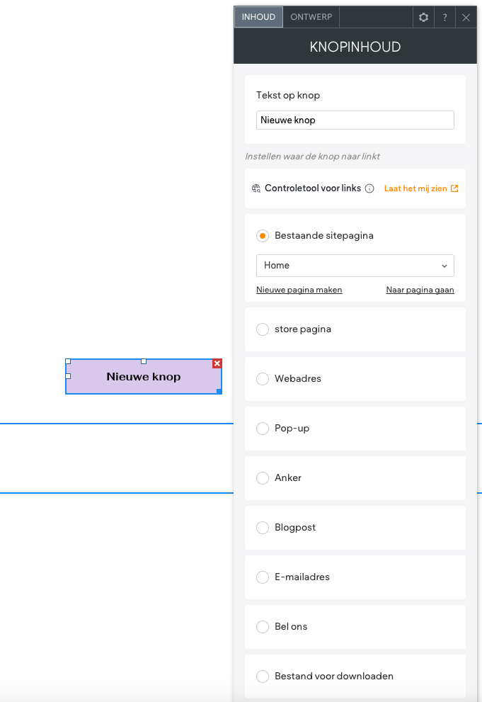 Je kan de knop laten doorverwijzen naar een "Bestaande pagina" op je website, dit kan ook een store pagina zijn mits je het MijnWebshop pakket hebt. Je kunt de knop dan naar een categorie pagina of een product naar keuze verwijzen. Het kan natuurlijk voorkomen dat jij je bezoekers via een knop naar een andere website wilt leiden. In dit geval kan je gebruik maken van de "Webadres" optie. Wil je de knop liever gebruiken om een "Pop-up" te openen, of bezoekers naar een "Anker" te sturen? Dan is dit ook mogelijk!