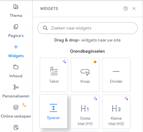 De "Spacer" widget is te vinden in het "Widgets" menu, in de linkerbalk van je websitemaker. Je kan hem terugvinden onder "Grondbeginselen" óf het "zoeken naar widgets" venster gebruiken.