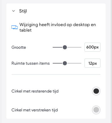 "Stijl" stelt je in staat de "Grootte" van jouw Aftelling widget te wijzigen. Ook kan je de "Ruimte tussen items" hier aanpassen. "Cirkel met resterende tijd" én "Cirkel met verstreken tijd" kan je gebruiken om de kleur van deze elementen aan te passen zodat deze het design van jouw website complimenteren.