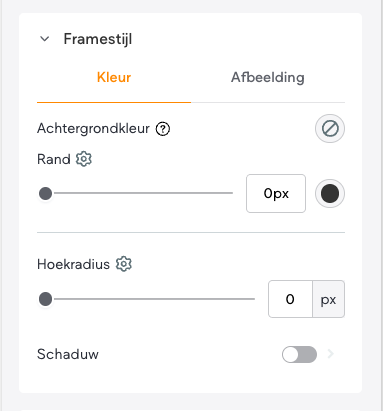 "Framestijl" kan je gebruiken om een venster om jouw Aftelling widget heen te plaatsen. Stel een "Achtergrondkleur" óf "Afbeelding" in wanneer de normale achtergrond niet naar jouw smaak is. "Rand" plaatst een venster om jouw widget heen. Deze kan je aanpassen in dikte en kleur. Gebruik vervolgens "Afgeronde hoeken" en "Schaduw" om het venster een finishing touch te geven.