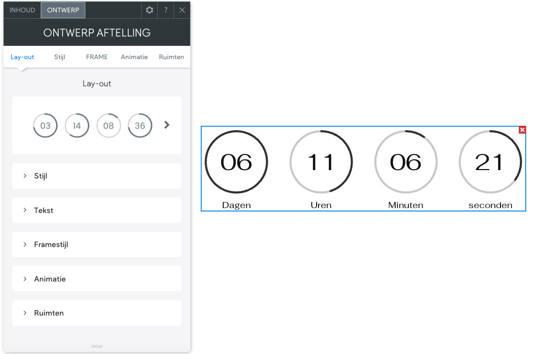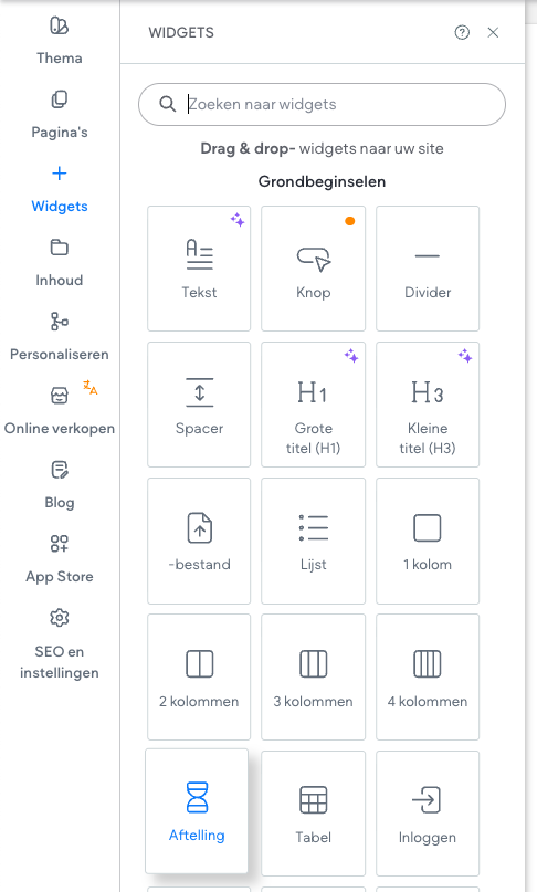 Widgets zijn de bouwstenen van jouw websitemaker website. In dit artikel zullen wij de "Aftelling"(Countdown) widget toelichten.
