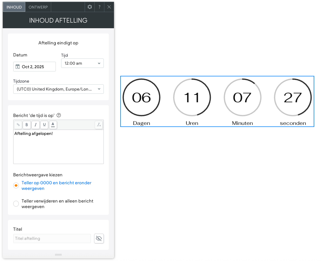 Je kan een "Bericht 'de tijd is op'" instellen. Dit is het bericht dat weergeven zal worden wanneer de aftelling afgerond is en jij dus je speciale onthulling doet óf je actie afloopt, bijvoorbeeld. Daarnaast kan je er nog voor kiezen de "Teller op 0000 te zetten en het bericht hieronder te weergeven" óf de "Teller te verwijderen en enkel het bericht te weergeven".
