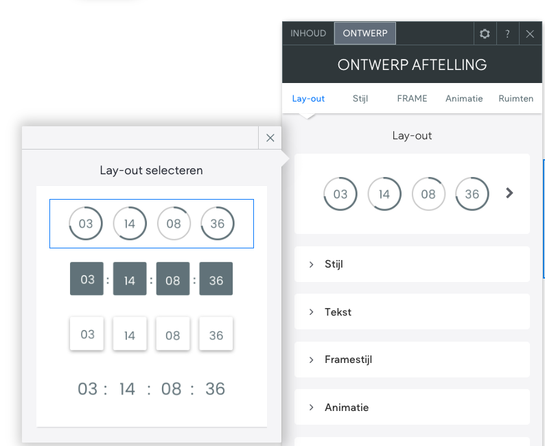 Via "Lay-out" kan je de vorm van jouw aftelklok wijzigen. Zo kan je kiezen voor een ronde klok met aflopende cirkels (deze is standaard actief), maar ook één van de andere lay-outs.