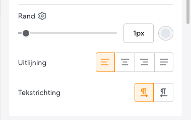 "Rand" laat je de scheidingslijnen van je tabel aanpassen. Met de schuifregelaar kan je de dikte van de lijnen aanpassen en via de kleurknop achter de schuifregelaar kan je de kleur van de lijnen aanpassen. "Uitlijning" zal de gehele tabel voor je uitlijnen waar "Tekstrichting" je de kolommen laat omdraaien.
