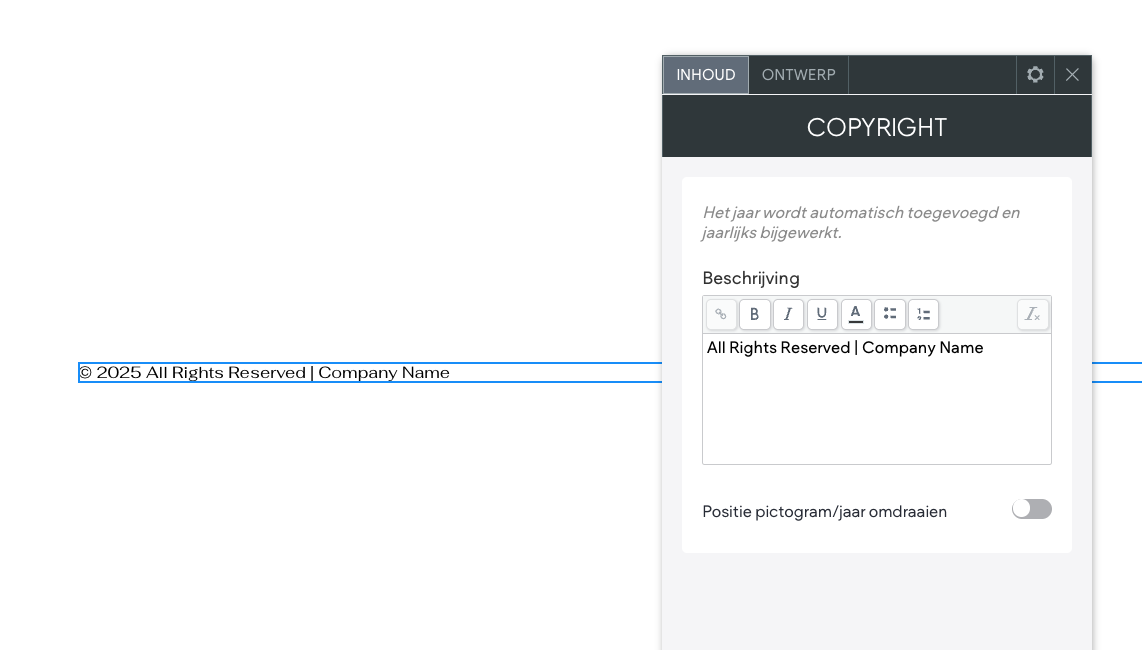 Standaard stellen wij de inhoud voor je in op "Alle rechten voorbehouden | Bedrijfsnaam". Je kan hier dus enkel "Bedrijfsnaam" vervangen met jouw bedrijfsnaam, maar je mag natuurlijk ook de gehele zin aanpassen.