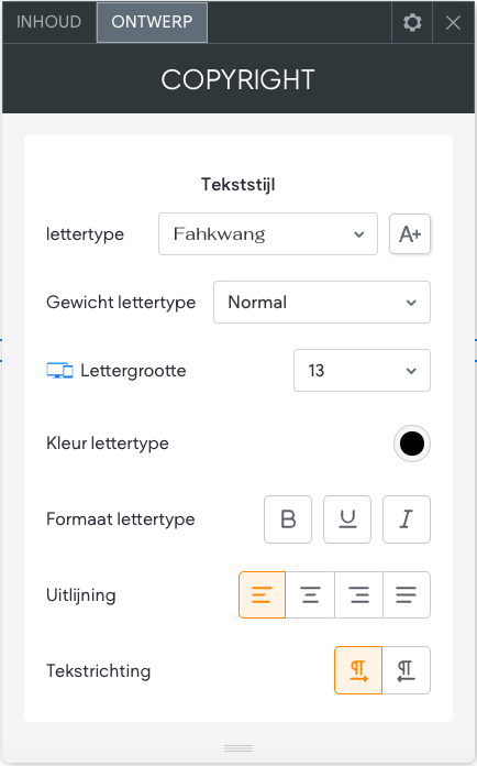 Je kan de "Inhoud" en het "Ontwerp" bewerken van de Copyright widget. In de onderstaande afbeelding zie je terug wat er onder de "Inhoud" valt van de copyright widget.