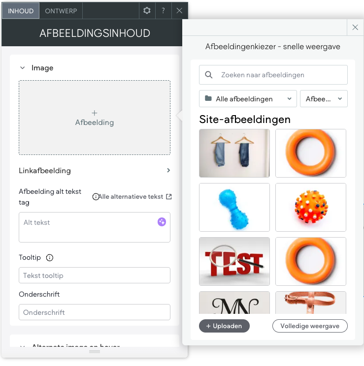 Via de "+ Uploaden" knop kan je je eigen afbeeldingen naar de site uploaden. Gebruik je liever andere afbeeldingen? Geen probleem! Via het dropdown menu kan je "Gratis afbeelding" selecteren. Dit zijn "Stock" afbeeldingen die je vrij mag gebruiken voor je website (**LET OP: Dus enkel voor je website. Gebruik deze niet op bijvoorbeeld drukwerk**). Via "Premiumafbeeldingen" kan je eventueel afbeeldingen aanschaffen. "Site-afbeeldingen" bevat de afbeeldingen specifiek voor jouw sjabloon en "Geüpload" weergeeft de afbeeldingen die jij zelf op de website geplaatst hebt.
