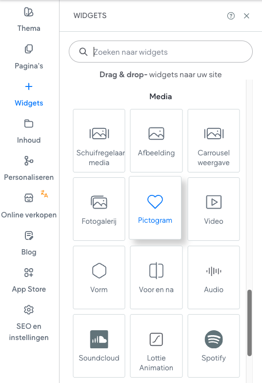 De "Pictogram" widget is te vinden in het "Widgets" menu, in de linkerbalk van je websitemaker. Je kan hem terugvinden onder "Media" óf het "zoeken naar widgets" venster gebruiken.