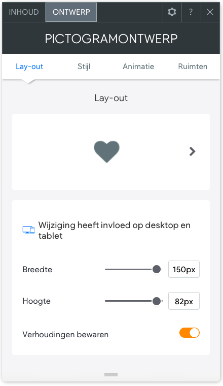 De "Breedte" en "Hoogte" schuifregelaars kan je gebruiken om de dimensies van je pictogram te wijzigen. Wil je de verhoudingen niet bewaren (Dit raden we wel aan, het pictogram zal anders namelijk vervormen), dan kan je de schuifknop "Verhouding bewaren" uitzetten.