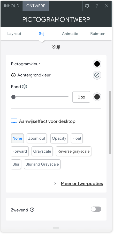 Door een "Aanwijseffect voor desktop" te selecteren, kan je een effect plaatsen op je pictogram. Wanneer een bezoeker dan met zijn of haar muis over het pictogram heen gaat, zal het dit effect uitvoeren. Hetzelfde geldt voor "Pictogramkleur aanwijzen" én "Achtergrondkleur aanwijzen".