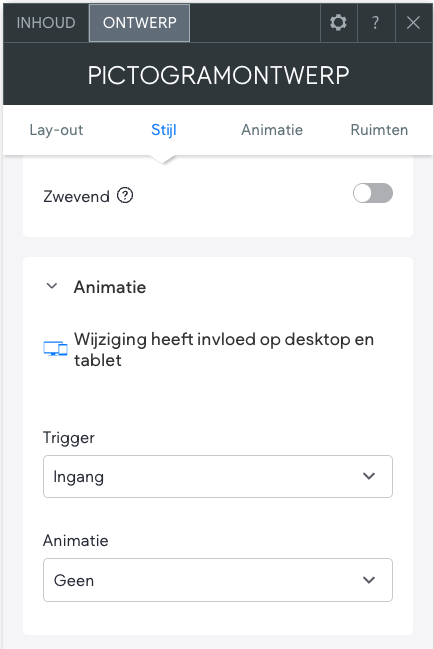 Via "Animatie" kan je het Pictogram laten bewegen. Zo kan je een "Trigger" kiezen, dit is de oorzaak voor het bewegen (Bijvoorbeeld het laden van de pagina) en een "Animatie", wat dus de daadwerkelijke animatie van het Pictogram bepaalt.